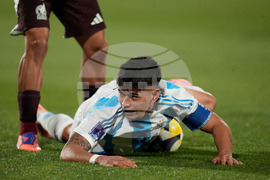 Argentina's Julio Soler falls during a FIFA U-20 World Cup quater-final soccer match against Mexico at National Stadium in Santiago, Chile, Saturday, Oct. 11, 2025. (AP Photo/Matias Delacroix)