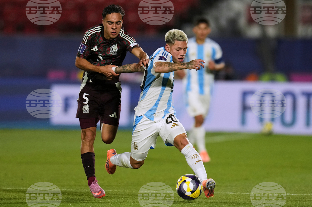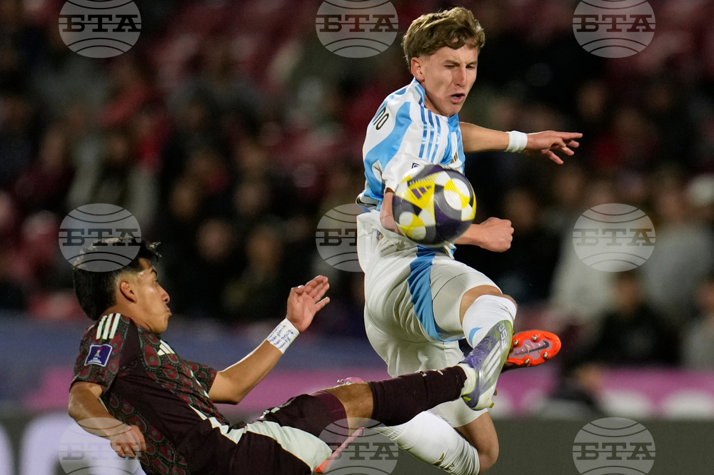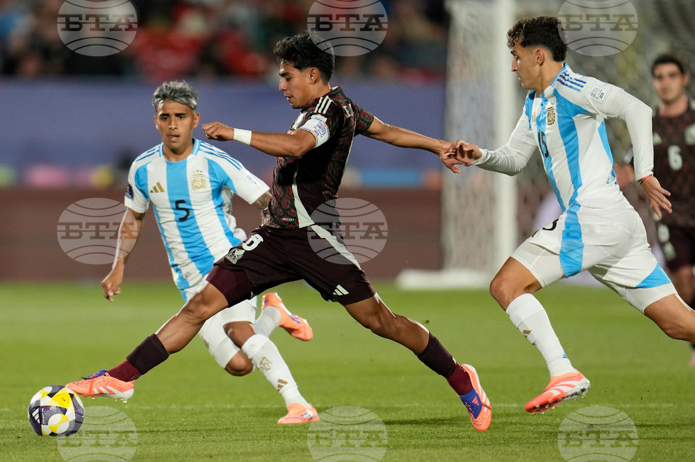 Mexico's Diego Sanchez, left, and Argentina's Santino Andino battle for the ball during a FIFA U-20 World Cup quater-final soccer match at National Stadium in Santiago, Chile, Saturday, Oct. 11, 2025. (AP Photo/Matias Delacroix)