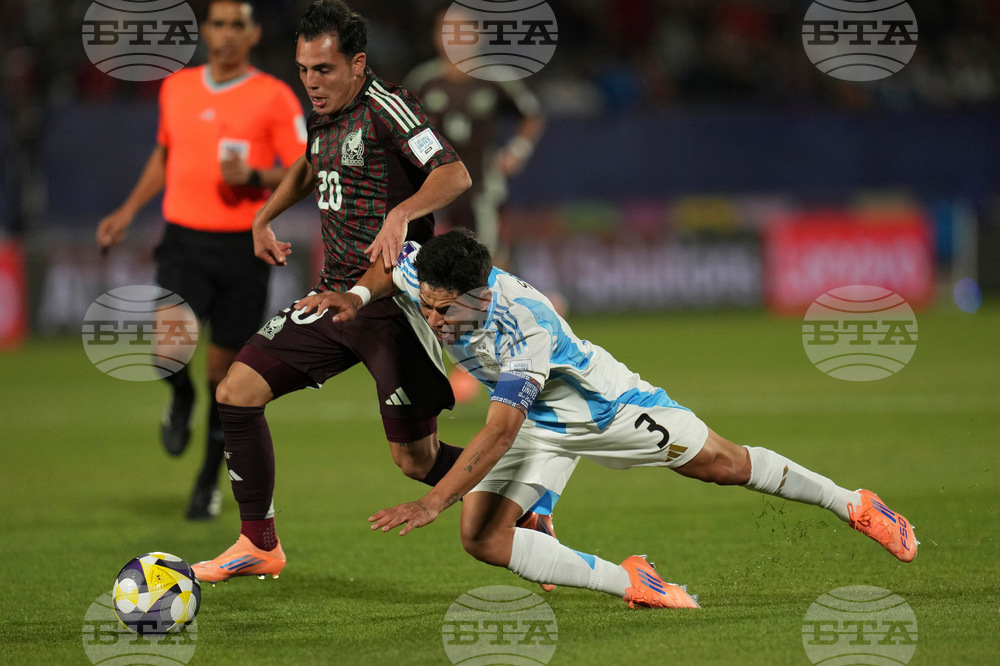 Mexico's Cesar Garza, right, and Argentina's Alejo Sarco battle for the ball during a FIFA U-20 World Cup quater-final soccer match at National Stadium in Santiago, Chile, Saturday, Oct. 11, 2025. (AP Photo/Esteban Felix)
