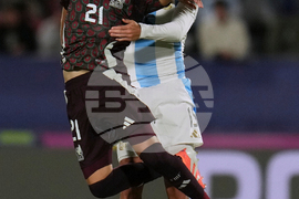 Argentina's Julio Soler, right, and Mexico's Hugo Camberos battle for the ball during a FIFA U-20 World Cup quater-final soccer match at National Stadium in Santiago, Chile, Saturday, Oct. 11, 2025. (AP Photo/Esteban Felix)