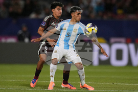 Argentina's Gianluca Prestianni controls the ball during a FIFA U-20 World Cup quater-final soccer match against Mexico at National Stadium in Santiago, Chile, Saturday, Oct. 11, 2025. (AP Photo/Esteban Felix)