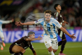 Argentina's Maher Carrizo celebrates scoring his side's first goal against Mexico during a FIFA U-20 World Cup quater-final soccer match at National Stadium in Santiago, Chile, Saturday, Oct. 11, 2025. (AP Photo/Esteban Felix)