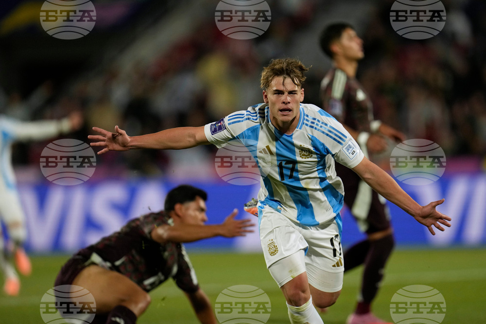 Argentina's Mateo Silvetti celebrates scoring his side's second goal against Mexico during a FIFA U-20 World Cup quater-final soccer match at National Stadium in Santiago, Chile, Saturday, Oct. 11, 2025. (AP Photo/Matias Delacroix)
