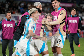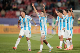 Argentina players celebrate defeating Mexico during a FIFA U-20 World Cup quater-final soccer match at National Stadium in Santiago, Chile, Saturday, Oct. 11, 2025. (AP Photo/Matias Delacroix)