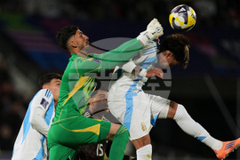 Argentina's Mateo Silvetti, left, and Mexico's Diego Ochoa go for a header during a FIFA U-20 World Cup quater-final soccer match at National Stadium in Santiago, Chile, Saturday, Oct. 11, 2025. (AP Photo/Esteban Felix)