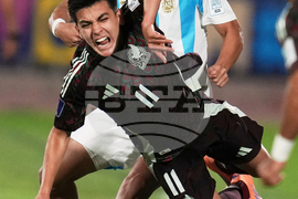 Argentina's Milton Delgado (5) and Mexico's Elias Montiel fight for the ball during a FIFA U-20 World Cup quater-final soccer match at National Stadium in Santiago, Chile, Saturday, Oct. 11, 2025. (AP Photo/Esteban Felix)