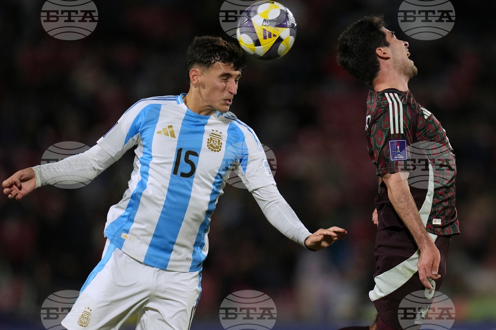 Mexico's Diego Ochoa (4) and Argentina's Valentino Acuna go for a header during a FIFA U-20 World Cup quater-final soccer match at National Stadium in Santiago, Chile, Saturday, Oct. 11, 2025. (AP Photo/Esteban Felix)