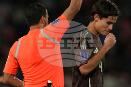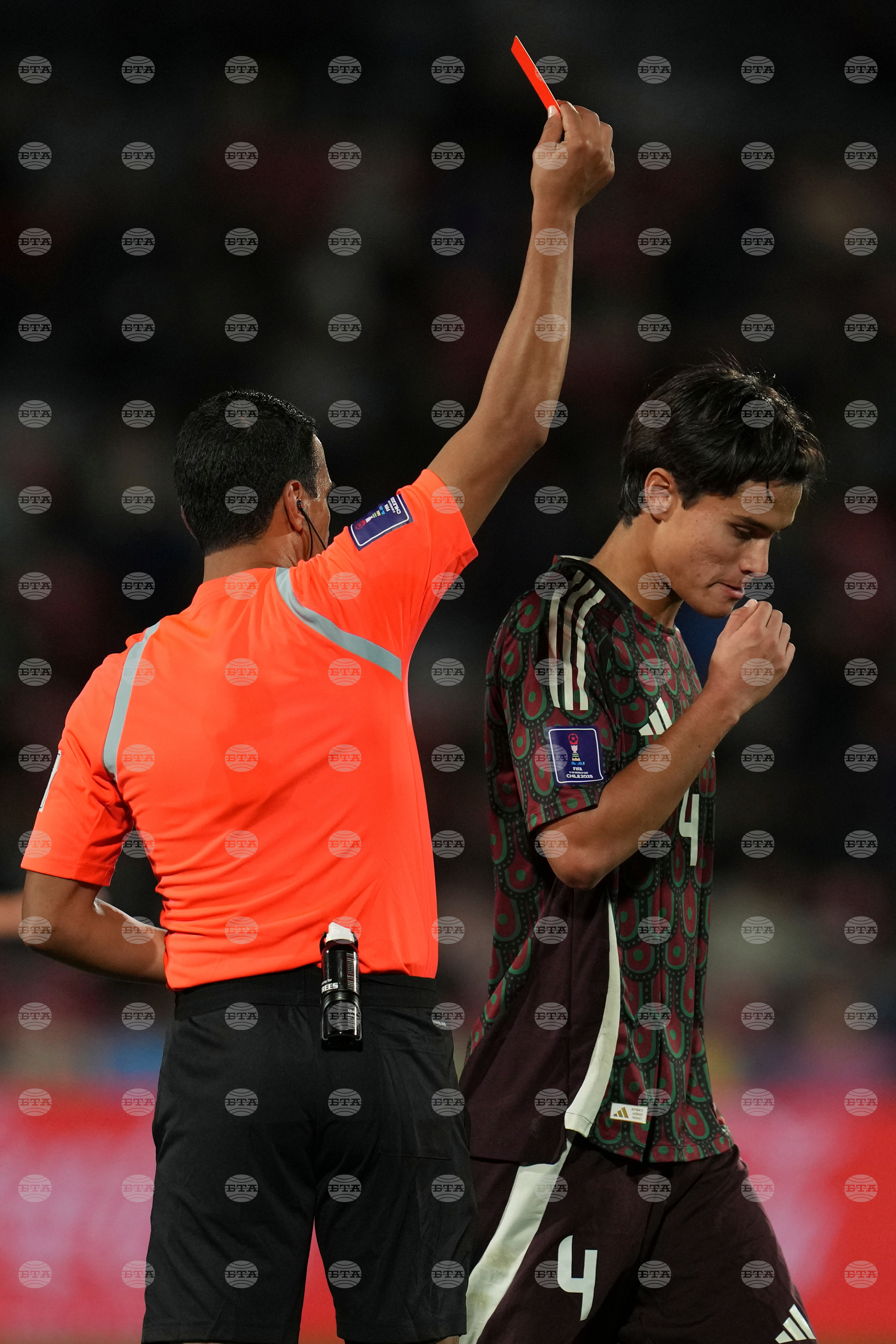 Referee Jalal Jayed shows the red card to Mexico's Diego Ochoa during a FIFA U-20 World Cup quater-final soccer match against Argentina at National Stadium in Santiago, Chile, Saturday, Oct. 11, 2025. (AP Photo/Esteban Felix)