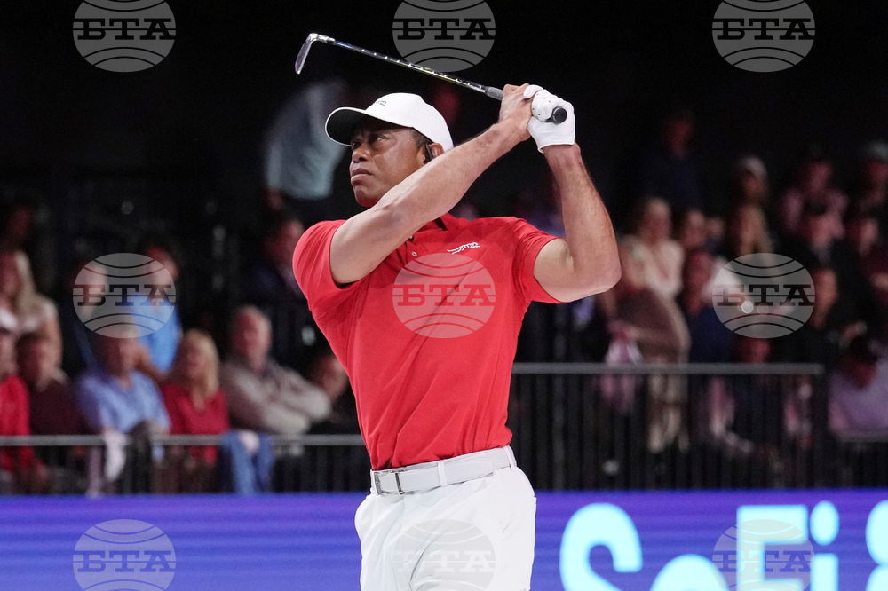 FILE - Tiger Woods of the Jupiter Links Golf Club tees off from the 12th hole during a match against the Los Angeles Golf Club, Jan. 14, 2025, in Palm Beach Gardens, Fla. (AP Photo/Marta Lavandier, File)