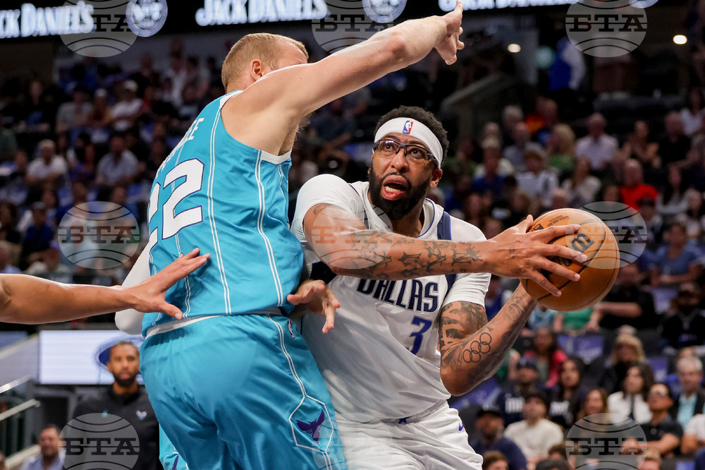 Dallas Mavericks center Anthony Davis (3) drives to the basket past Charlotte Hornets center Mason Plumlee (22) during the first half of an NBA basketball preseason game in Dallas, Saturday, Oct. 11, 2025. (AP Photo/Gareth Patterson)