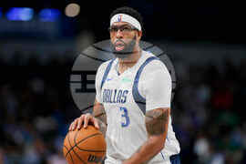 Dallas Mavericks forward/center Anthony Davis (3) brings the ball down court during the first half of an NBA basketball preseason game against the Charlotte Hornets in Dallas, Saturday, Oct. 11, 2025. (AP Photo/Gareth Patterson)
