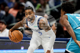 Dallas Mavericks guard D'Angelo Russell (5) looks to the basket while Charlotte Hornets guard Collin Sexton, right, defends during the first half of an NBA basketball preseason game in Dallas, Saturday, Oct. 11, 2025. (AP Photo/Gareth Patterson)