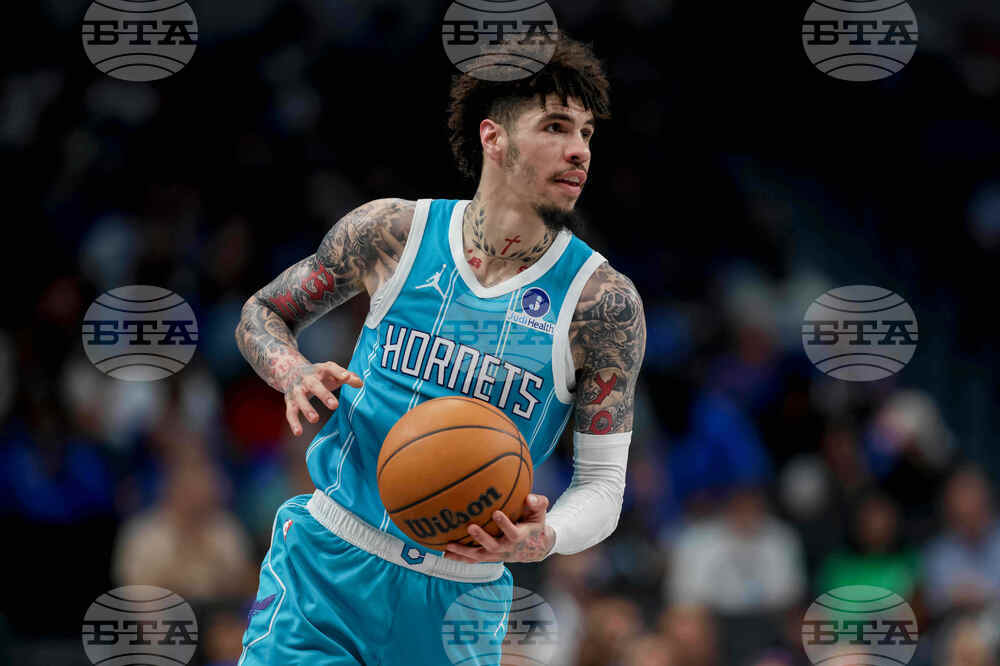 Charlotte Hornets guard Lamelo Ball looks to pass during the second half of an NBA basketball preseason game against the Dallas Mavericks in Dallas, Saturday, Oct. 11, 2025. (AP Photo/Gareth Patterson)