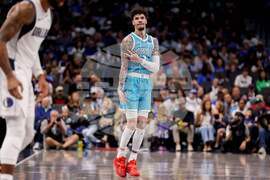 Charlotte Hornets guard Lamelo Ball (1) walks to mid-court after a foul call during the first half of an NBA basketball preseason game against the Dallas Mavericks in Dallas, Saturday, Oct. 11, 2025. (AP Photo/Gareth Patterson)