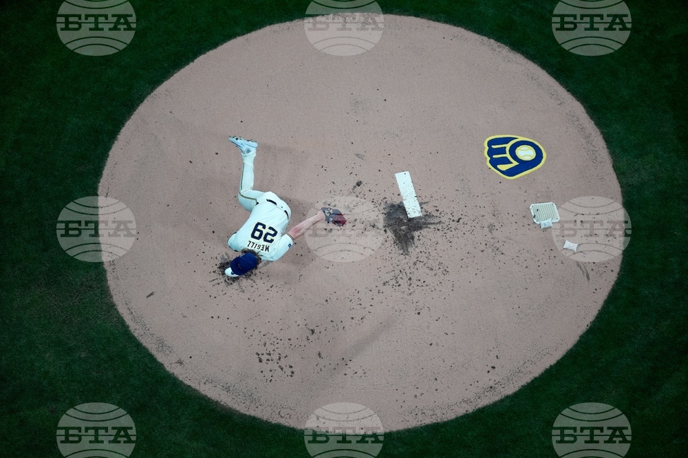 Milwaukee Brewers pitcher Trevor Megill (29) reacts after striking out Chicago Cubs' Kyle Tucker during the first inning of Game 5 of baseball's National League Division Series Saturday, Oct. 11, 2025, in Milwaukee. (AP Photo/Kayla Wolf)