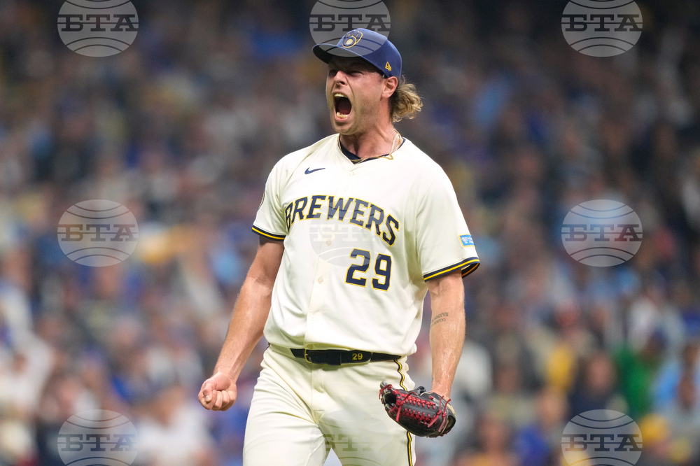 Milwaukee Brewers' Abner Uribe celebrates after winning Game 5 of baseball's National League Division Series against the Chicago Cubs Saturday, Oct. 11, 2025, in Milwaukee. (AP Photo/Morry Gash)