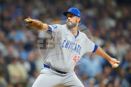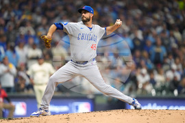 Chicago Cubs pitcher Colin Rea delivers a pitch against the Milwaukee Brewers during the second inning of Game 5 of baseball's National League Division Series Saturday, Oct. 11, 2025, in Milwaukee. (AP Photo/Kayla Wolf)