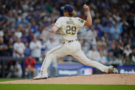 Milwaukee Brewers pitcher Trevor Megill (29) delivers a pitch against the Chicago Cubs during the first inning of Game 5 of baseball's National League Division Series Saturday, Oct. 11, 2025, in Milwaukee. (AP Photo/Kayla Wolf)