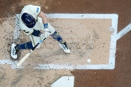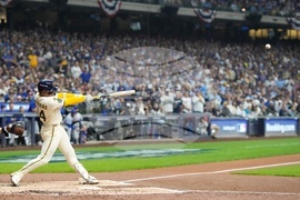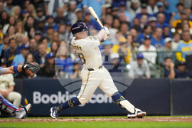 Milwaukee Brewers first baseman Andrew Vaughn (28) hits a solo home run against the Chicago Cubs during the fourth inning of Game 5 of baseball's National League Division Series, Saturday, Oct. 11, 2025, in Milwaukee. (AP Photo/Kayla Wolf)