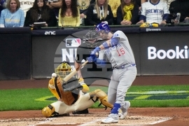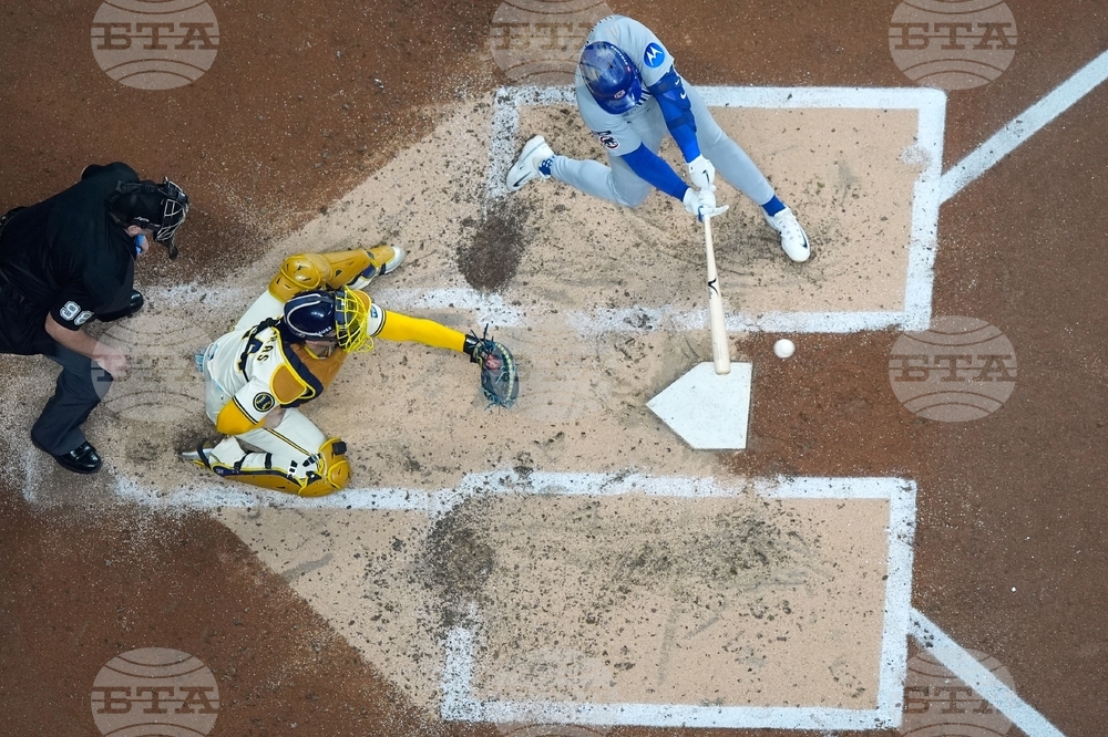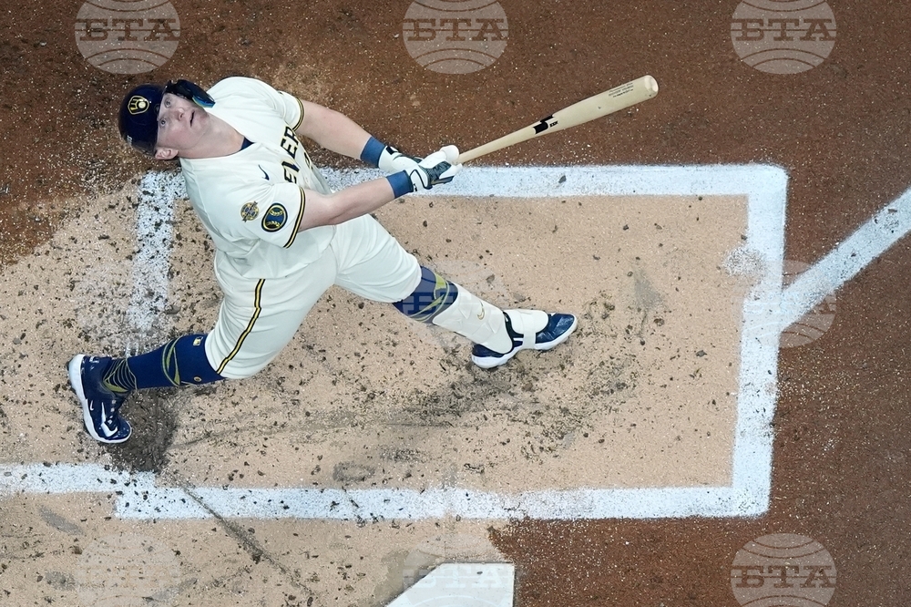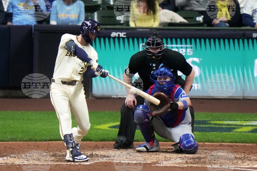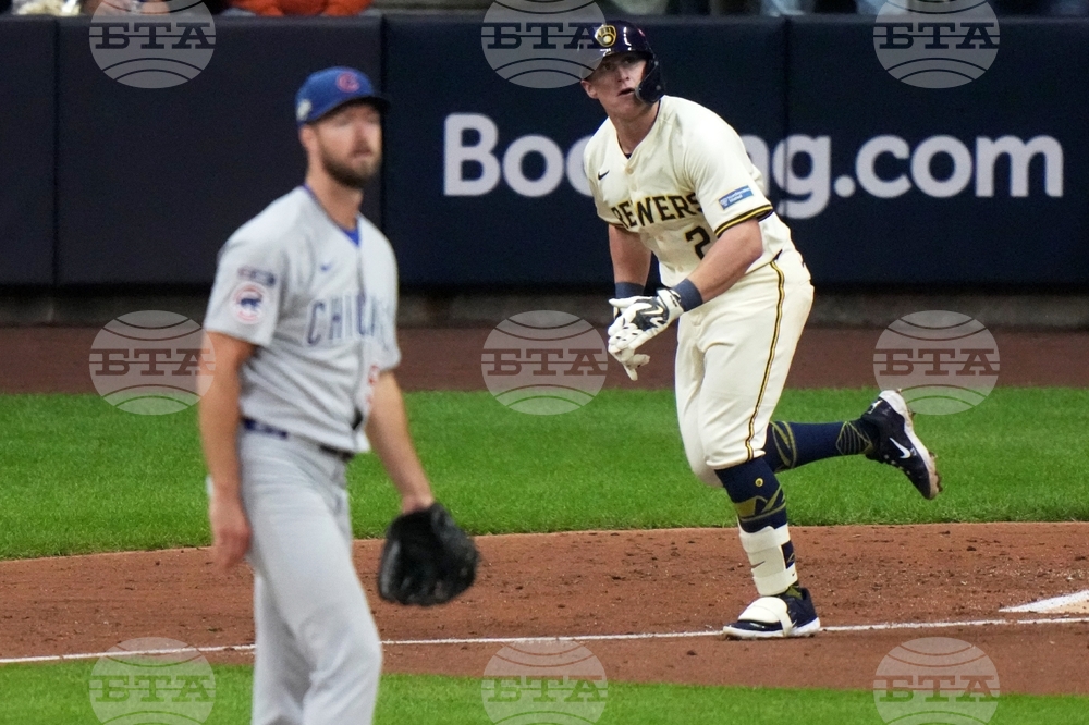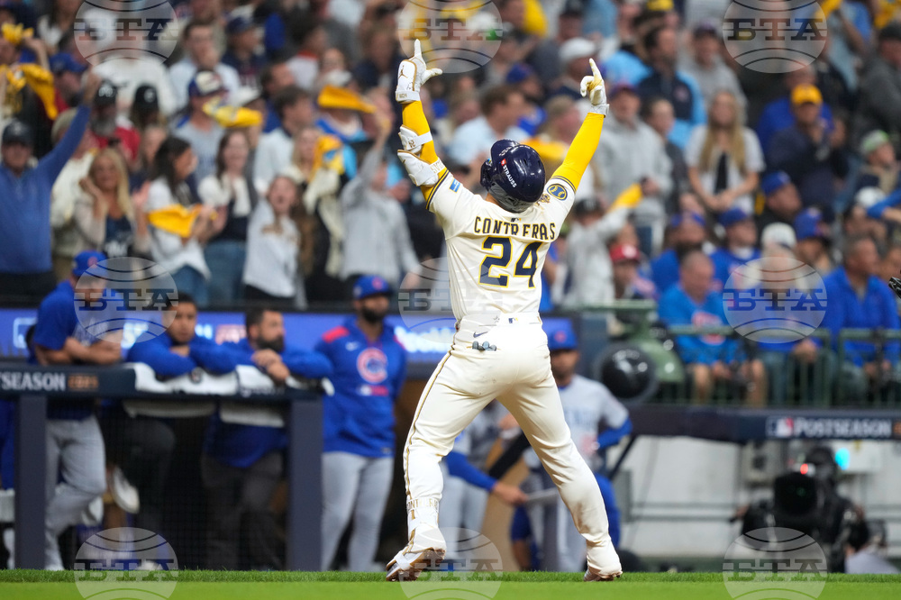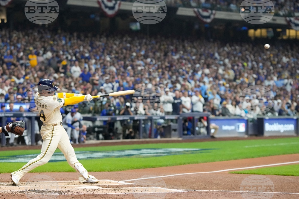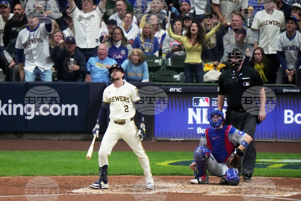 Milwaukee Brewers' Andrew Vaughn hits a home run during the fourth inning of Game 5 of baseball's National League Division Series against the Chicago Cubs Saturday, Oct. 11, 2025, in Milwaukee. (AP Photo/Morry Gash)