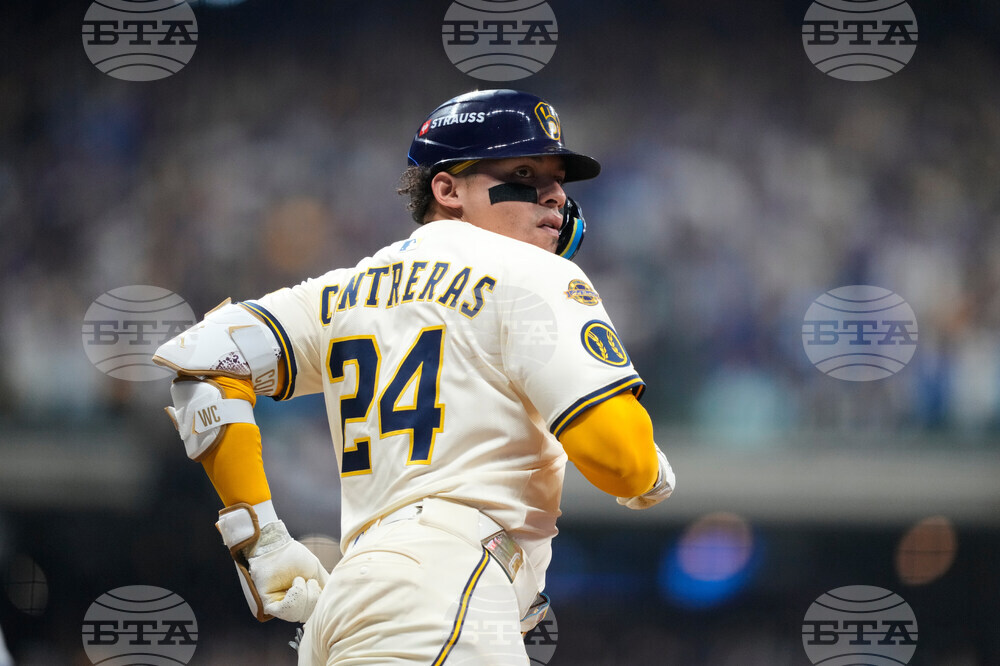 Milwaukee Brewers catcher William Contreras (24) rounds the bases after hitting a solo homer against the Chicago Cubs during the first inning of Game 5 of baseball's National League Division Series Saturday, Oct. 11, 2025, in Milwaukee. (AP Photo/Kayla Wolf)