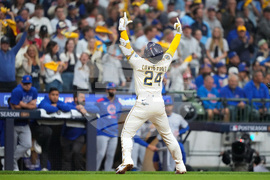 Milwaukee Brewers' Brice Turang watches his home run during the seventh inning of Game 5 of baseball's National League Division Series against the Chicago Cubs Saturday, Oct. 11, 2025, in Milwaukee. (AP Photo/Morry Gash)