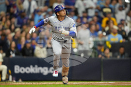 Milwaukee Brewers' Brice Turang hits a home run during the seventh inning of Game 5 of baseball's National League Division Series against the Chicago Cubs Saturday, Oct. 11, 2025, in Milwaukee. (AP Photo/Morry Gash)