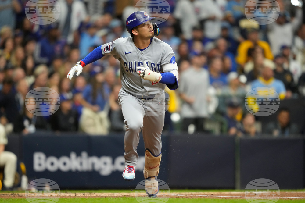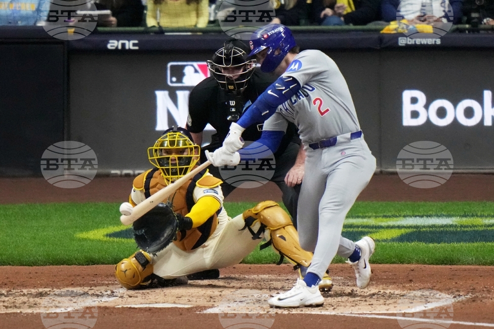 Chicago Cubs' Nico Hoerner hits a single during the third inning of Game 5 of baseball's National League Division Series against the Milwaukee Brewers Saturday, Oct. 11, 2025, in Milwaukee. (AP Photo/Morry Gash)