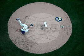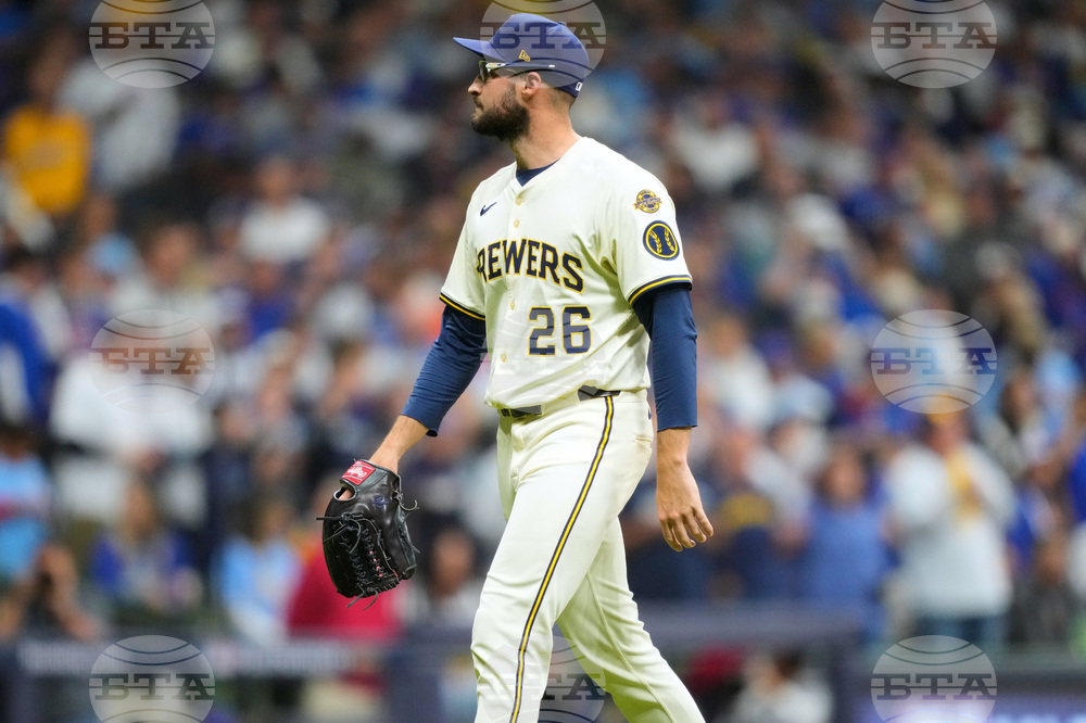 Milwaukee Brewers pitcher Aaron Ashby (26) walks off the field after a pitching change during the sixth inning of Game 5 of baseball's National League Division Series against the Chicago Cubs, Saturday, Oct. 11, 2025, in Milwaukee. (AP Photo/Kayla Wolf)