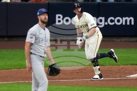 Milwaukee Brewers' Andrew Vaughn reacts after hitting a home run during the fourth inning of Game 5 of baseball's National League Division Series against the Chicago Cubs Saturday, Oct. 11, 2025, in Milwaukee. (AP Photo/Morry Gash)