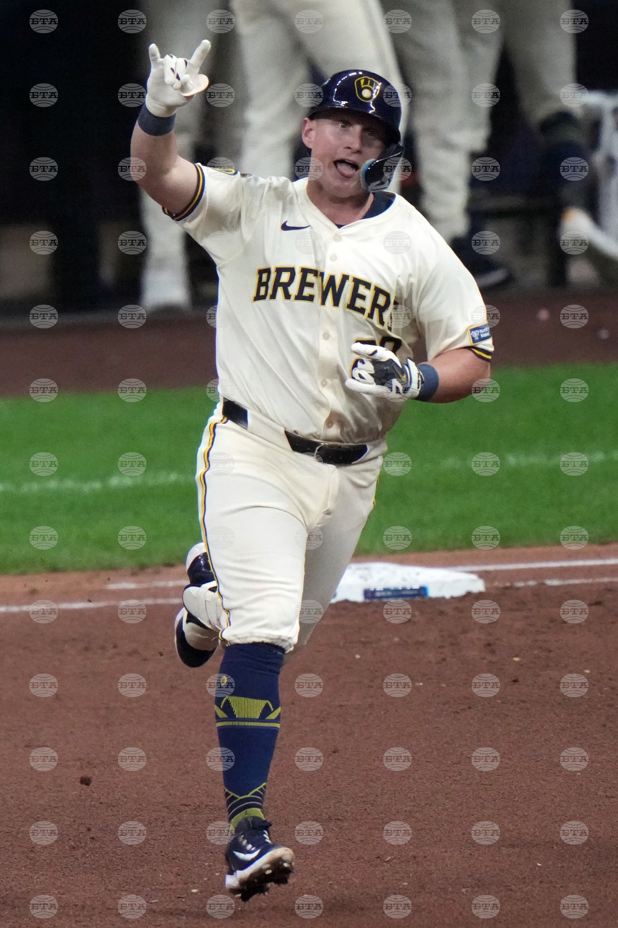 Milwaukee Brewers first baseman Andrew Vaughn (28) reacts after hitting a solo home run against the Chicago Cubs during the fourth inning of Game 5 of baseball's National League Division Series, Saturday, Oct. 11, 2025, in Milwaukee. (AP Photo/Kayla Wolf)