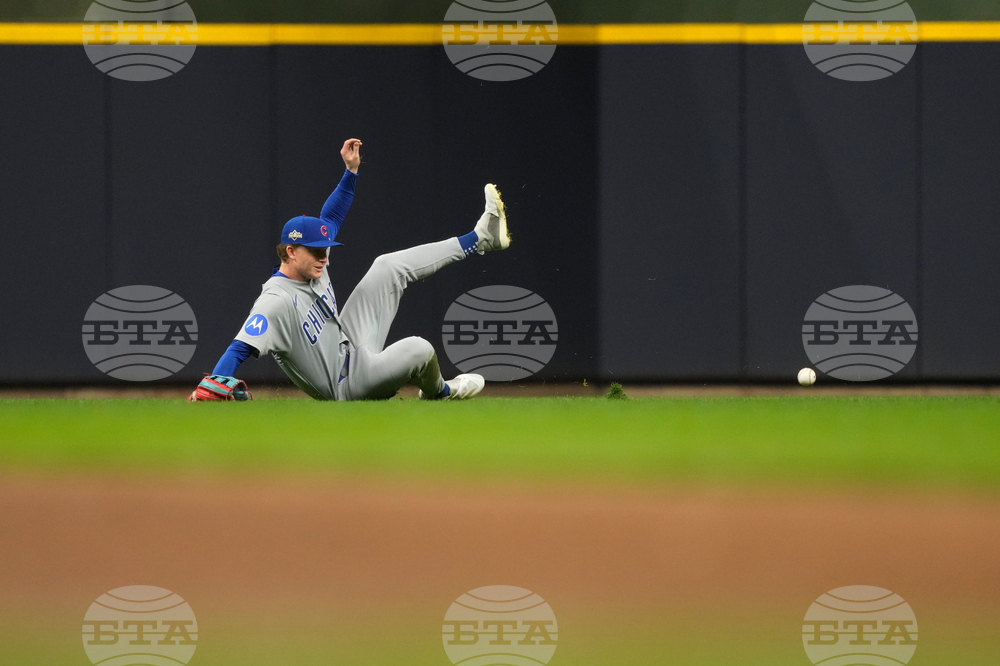 Chicago Cubs center fielder Pete Crow-Armstrong tries to field a hit by Milwaukee Brewers' Caleb Durbin during the fourth inning of Game 5 of baseball's National League Division Series, Saturday, Oct. 11, 2025, in Milwaukee. (AP Photo/Kayla Wolf)