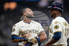 Milwaukee Brewers' William Contreras and Abner Uribe after Game 5 of baseball's National League Division Series against the Chicago Cubs Saturday, Oct. 11, 2025, in Milwaukee. (AP Photo/Morry Gash)