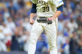 Milwaukee Brewers pitcher Chad Patrick (39) reacts after striking out Chicago Cubs shortstop Dansby Swanson (7) during the seventh inning of Game 5 of baseball's National League Division Series, Saturday, Oct. 11, 2025, in Milwaukee. (AP Photo/Kayla Wolf)