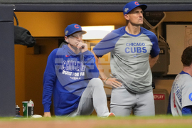 Chicago Cubs manager Craig Counsell, left, and bench coach Ryan Flaherty, right, look on from the dugout during the seventh inning of Game 5 of baseball's National League Division Series against the Milwaukee Brewers, Saturday, Oct. 11, 2025, in Milwaukee. (AP Photo/Kayla Wolf)