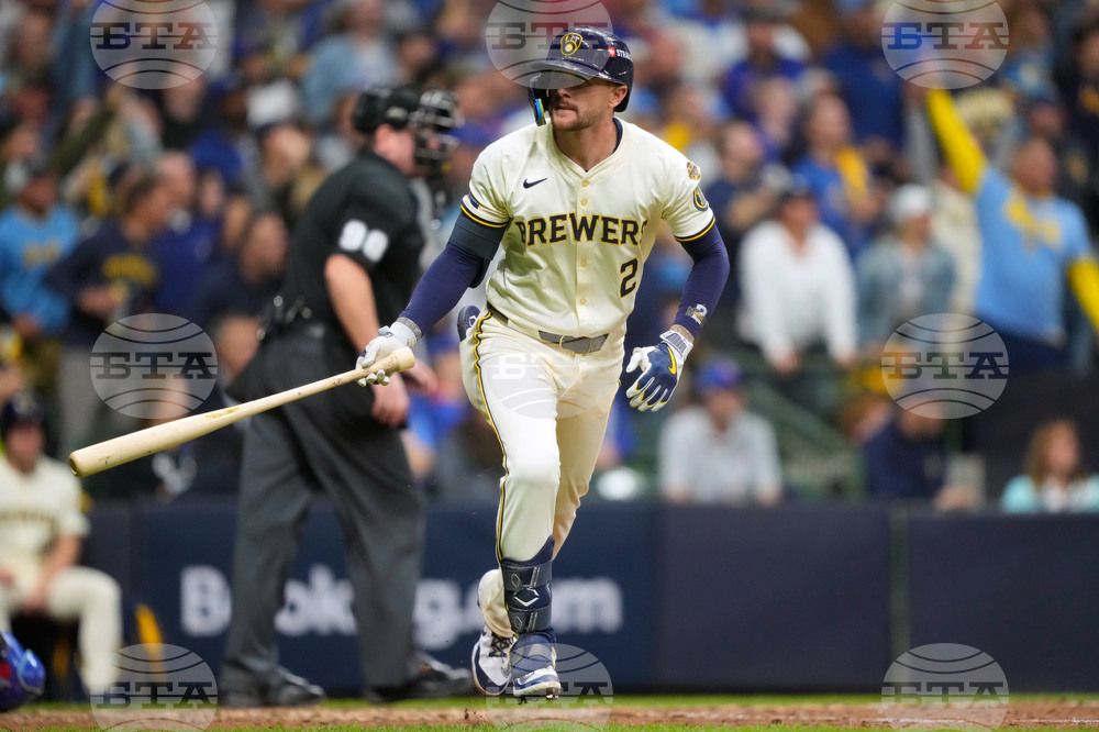 Milwaukee Brewers' Caleb Durbin hits a single during the second inning of Game 5 of baseball's National League Division Series against the Chicago Cubs Saturday, Oct. 11, 2025, in Milwaukee. (AP Photo/Morry Gash)