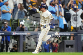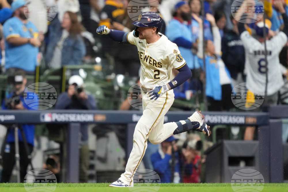 Milwaukee Brewers second baseman Brice Turang (2) rounds the bases after he hit a solo home run against the Chicago Cubs during the seventh inning of Game 5 of baseball's National League Division Series, Saturday, Oct. 11, 2025, in Milwaukee. (AP Photo/Kayla Wolf)