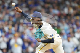 Milwaukee Brewers pitcher Abner Uribe (45) throws against the Chicago Cubs during the eighth inning of Game 5 of baseball's National League Division Series, Saturday, Oct. 11, 2025, in Milwaukee. (AP Photo/Kayla Wolf)