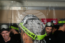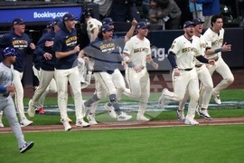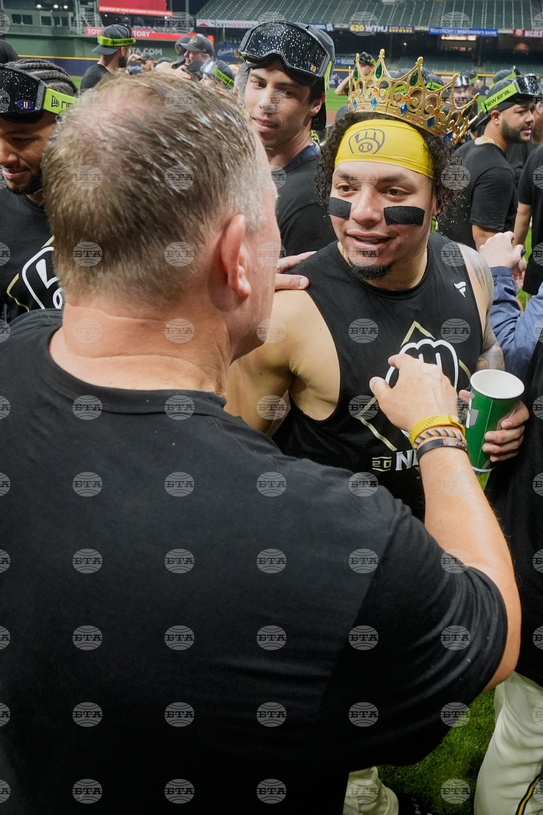 Milwaukee Brewers players celebrate their win over the Chicago Cubs in Game 5 of baseball's National League Division Series, Saturday, Oct. 11, 2025, in Milwaukee. (AP Photo/Kayla Wolf)
