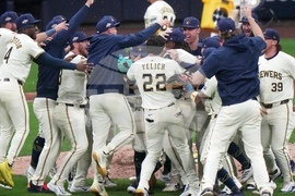 Milwaukee Brewers pitcher Quinn Priester, center, celebrates with teammates after their win over the Chicago Cubs in Game 5 of baseball's National League Division Series, Saturday, Oct. 11, 2025, in Milwaukee. (AP Photo/Kayla Wolf)