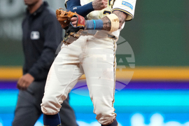 Milwaukee Brewers' Brice Turang hits home run during the seventh inning of Game 5 of baseball's National League Division Series against the Chicago Cubs Saturday, Oct. 11, 2025, in Milwaukee. (AP Photo/Morry Gash)