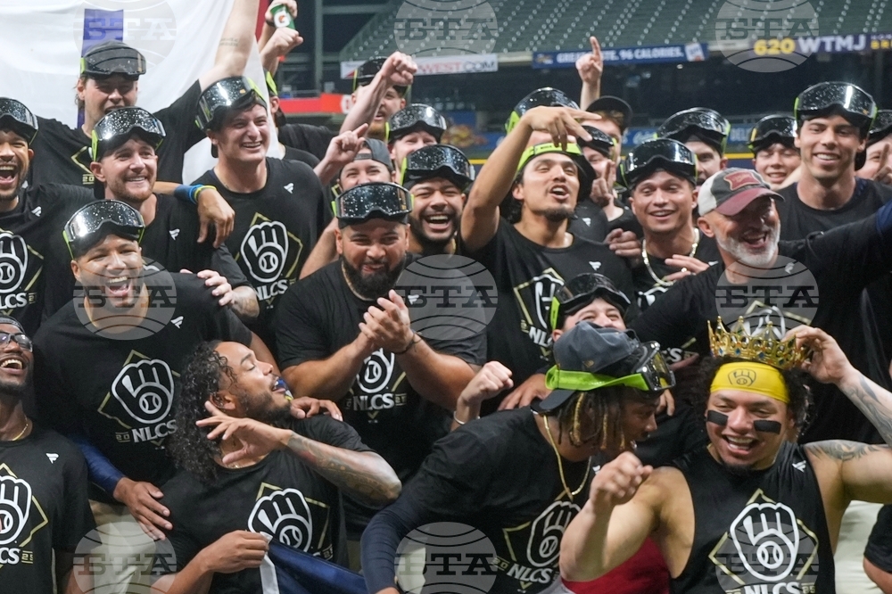 The Milwaukee Brewers celebrate after winning Game 5 of baseball's National League Division Series against the Chicago Cubs Saturday, Oct. 11, 2025, in Milwaukee. (AP Photo/Morry Gash)