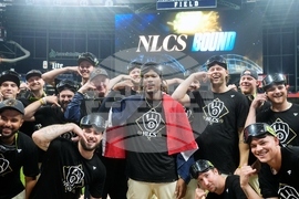 Milwaukee Brewers pose for a picture after Game 5 of baseball's National League Division Series against the Chicago Cubs Saturday, Oct. 11, 2025, in Milwaukee. (AP Photo/Morry Gash)