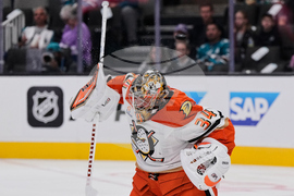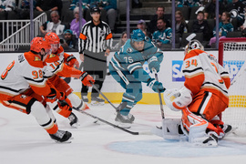 San Jose Sharks goaltender Yaroslav Askarov (30) watches a goal scored by Anaheim Ducks left wing Chris Kreider, right, during the second period of an NHL hockey game Saturday, Oct. 11, 2025, in San Jose, Calif. (AP Photo/Godofredo A. Vásquez)