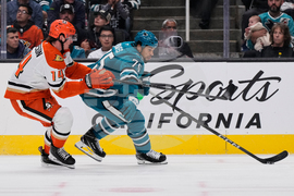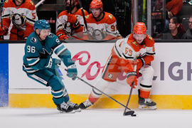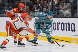 Anaheim Ducks center Mason McTavish (23) and San Jose Sharks defenseman Dmitry Orlov (9) compete for possession of the puck during the third period of an NHL hockey game, Saturday, Oct. 11, 2025, in San Jose, Calif. (AP Photo/Godofredo A. Vásquez)
