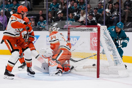 Anaheim Ducks goaltender Petr Mrazek (34) is unable to stop a goal by San Jose Sharks center Tyler Toffoli during the first period of an NHL hockey game Saturday, Oct. 11, 2025, in San Jose, Calif. (AP Photo/Godofredo A. Vásquez)