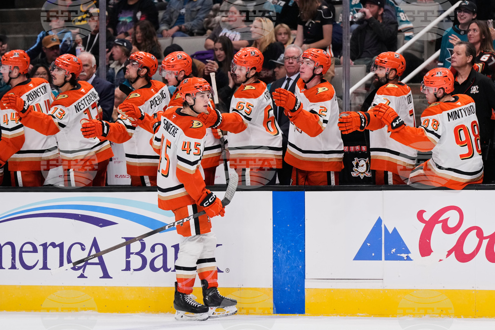 Anaheim Ducks right wing Beckett Sennecke (45) celebrates with teammates after scoring a goal during the first period of an NHL hockey game against the San Jose Sharks, Saturday, Oct. 11, 2025, in San Jose, Calif. (AP Photo/Godofredo A. Vásquez)