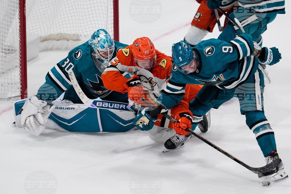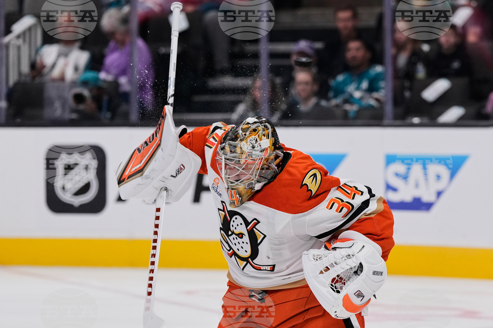 Anaheim Ducks goaltender Petr Mrazek (34) deflects a shot during the first period of an NHL hockey game against the San Jose Sharks, Saturday, Oct. 11, 2025, in San Jose, Calif. (AP Photo/Godofredo A. Vásquez)