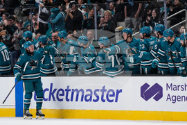 San Jose Sharks defenseman Mario Ferraro (38) celebrates with teammates after scoring a goal during the second period of an NHL hockey game against the Anaheim Ducks, Saturday, Oct. 11, 2025, in San Jose, Calif. (AP Photo/Godofredo A. Vásquez)