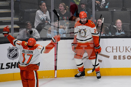 Anaheim Ducks left wing Chris Kreider, right, celebrates after scoring a goal against the San Jose Sharks during the third period of an NHL hockey game, Saturday, Oct. 11, 2025, in San Jose, Calif. (AP Photo/Godofredo A. Vásquez)